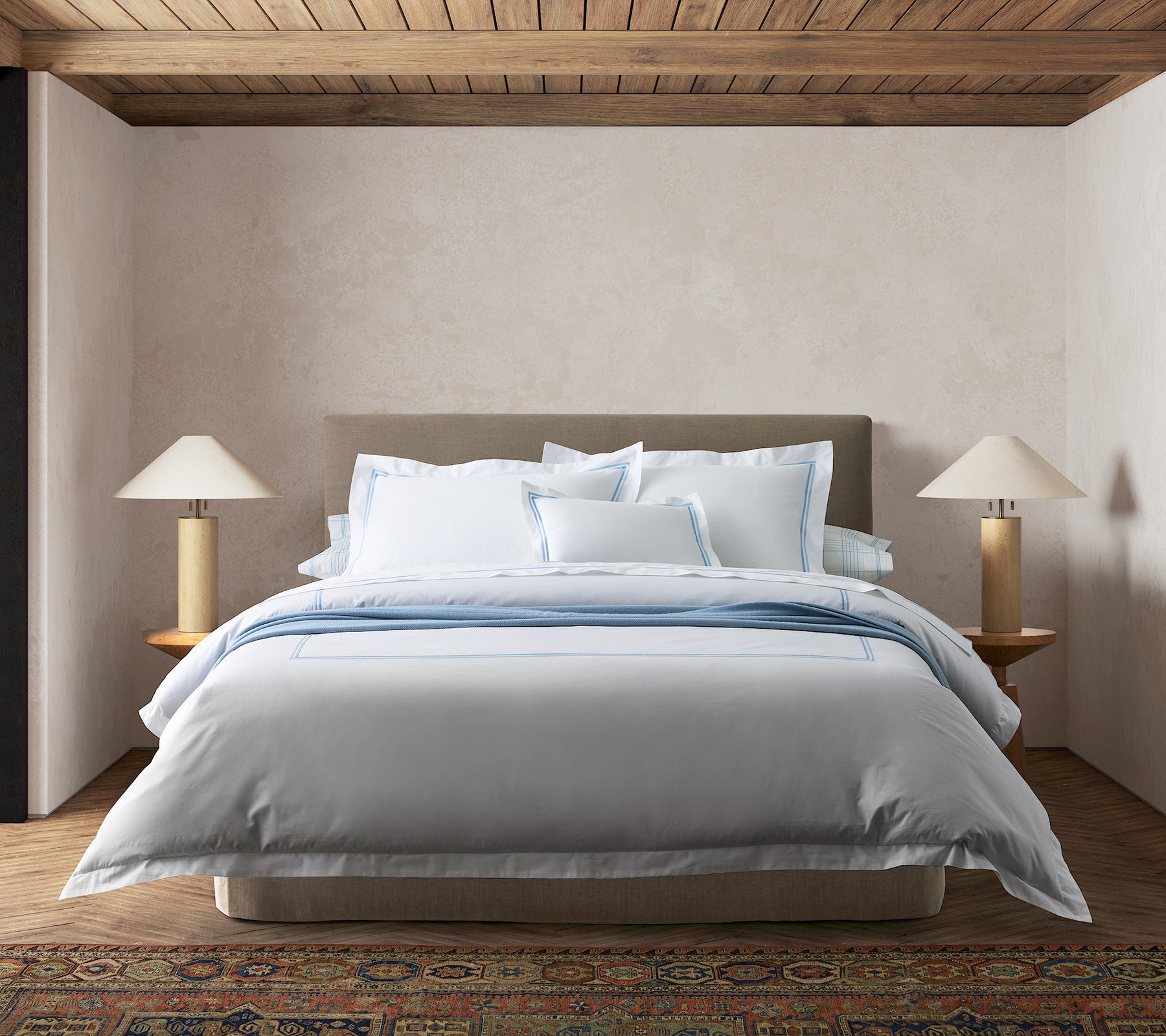 Crisp white percale sheeting features two lines of satin stitchin tonal colors