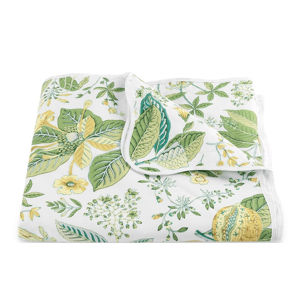 An 18th century botanical design from the Schumacher archive is printed on our Luca sheeting and finished with a subtle scallop.